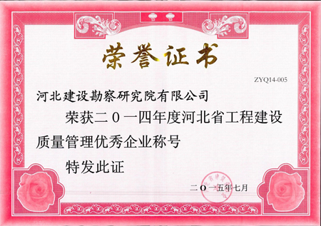 近日,根據(jù)河北省建筑業(yè)協(xié)會(huì)冀建協(xié)字[2105]25號(hào)文《關(guān)于繼續(xù)開展河北省工程建設(shè)質(zhì)量管理優(yōu)秀企業(yè)評(píng)選表彰活動(dòng)的通知》,我公司榮獲“二〇一四年度河北省工程建設(shè)質(zhì)量管理優(yōu)秀企業(yè)稱號(hào)”。