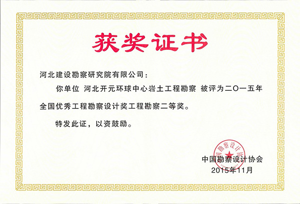 近日,公司兩項工程分別榮獲2015年度全國優(yōu)秀工程勘察設計工程勘察一、二等獎.一等獎:邯鄲金世紀新城巖土工程勘察、基坑支護、地下水控制及監(jiān)測;二等獎:河北開元環(huán)球中心巖土工程勘察。