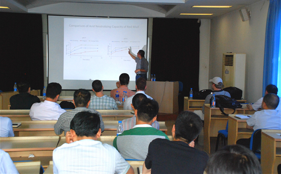 本次報告分為三個部分:胡偉博士介紹了赤泥地質聚合物的最新研究成果;何強教授介紹了赤泥用于煙氣脫硫的最新研究成果;四名美國學生就各自的研究方向和在中國的見聞,對交通、環(huán)境的可持續(xù)發(fā)展進行了介紹。報告會使我公司工程技術人員進一步了解了赤泥研究課題取得的成果與進展、巖土工程材料國際前沿動態(tài)、國際上的研究思路,同時也了解了美國人眼中的中國發(fā)展,此次到場參與報告的美方學生也表示有很大收獲。