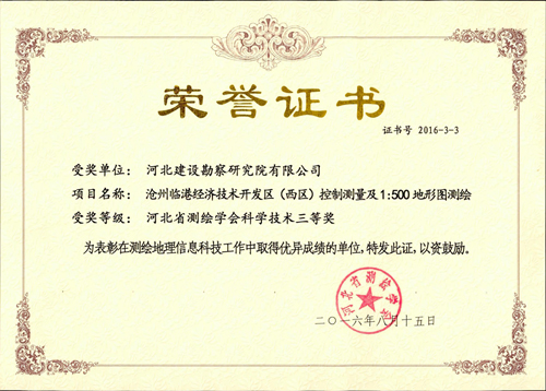 8月5日,我公司承擔的任丘市城鄉(xiāng)規(guī)劃局基礎(chǔ)測繪項目1、2標段被河北省測繪學會評為河北省優(yōu)秀地理信息工程一等獎;8月15日,我公司承擔的滄州臨港經(jīng)濟技術(shù)開發(fā)區(qū)(西區(qū))控制測量及1∶500地形圖測繪項目被河北省測繪學會評為河北省測繪學會科學技術(shù)三等獎。