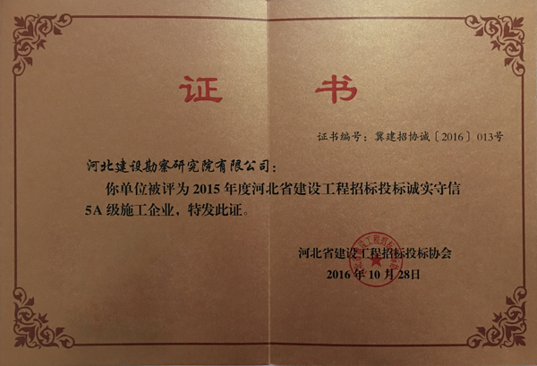 近日,公司被河北省建設(shè)工程招標(biāo)投標(biāo)協(xié)會(huì)評(píng)為2015年度河北省建設(shè)工程招標(biāo)投標(biāo)誠實(shí)守信5A級(jí)施工企業(yè)單位。