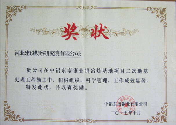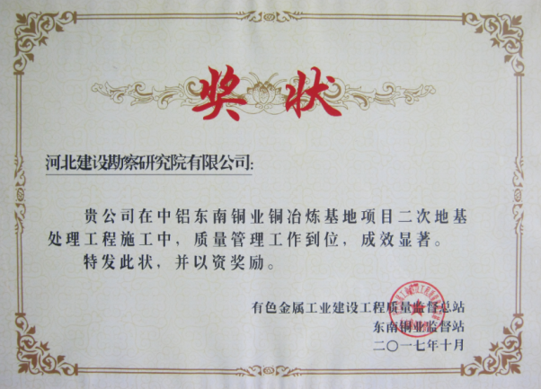公司承接的福建省寧德市中鋁東南銅業(yè)銅冶煉基地項目二次地基處理工程,施工中嚴格執(zhí)行公司規(guī)章制度及綜合管理體系標準,精心策劃,嚴格控制,科學管理。在現(xiàn)場10多家施工單位各項檢查評比中,得到了業(yè)主中鋁東南銅業(yè)有限公司的表揚,對現(xiàn)場安全、質(zhì)量、進度管理給予了高度評價,分別授予“項目管理突出”獎和“質(zhì)量管理”獎。