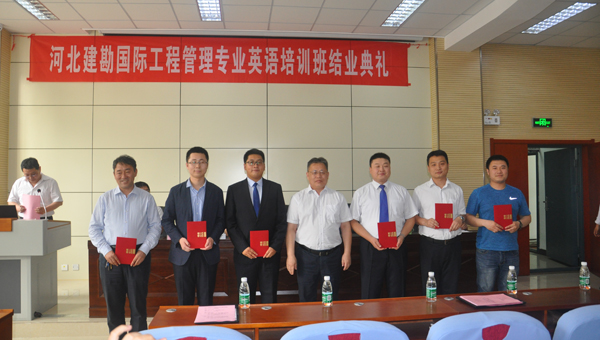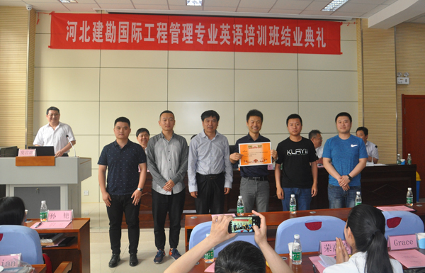 公司委托石家莊鐵道大學(xué)繼續(xù)教育學(xué)院舉辦的首屆國際工程管理專業(yè)英語培訓(xùn)班(共29人,分6組),經(jīng)過28天的緊張培訓(xùn),已經(jīng)完成全部課程的學(xué)習(xí)。2018年5月14日下午,石家莊鐵道大學(xué)第九實驗室103教室,書聲瑯瑯,掌聲雷鳴,公司首屆國際工程管理專業(yè)英語培訓(xùn)班結(jié)業(yè)典禮在這里舉行,出席結(jié)業(yè)典禮的有:公司總經(jīng)理李華偉、總工程師聶慶科、人力資源部主任張軍旗及全體學(xué)員;石家莊鐵道大學(xué)副校長陳進(jìn)杰、繼續(xù)教育學(xué)院院長王書海、繼續(xù)教育學(xué)院副院長楊杰、外語系黨支部書記林治華、外語系副主任李玉潔、培訓(xùn)班班主任孫艷以及教師和助教。