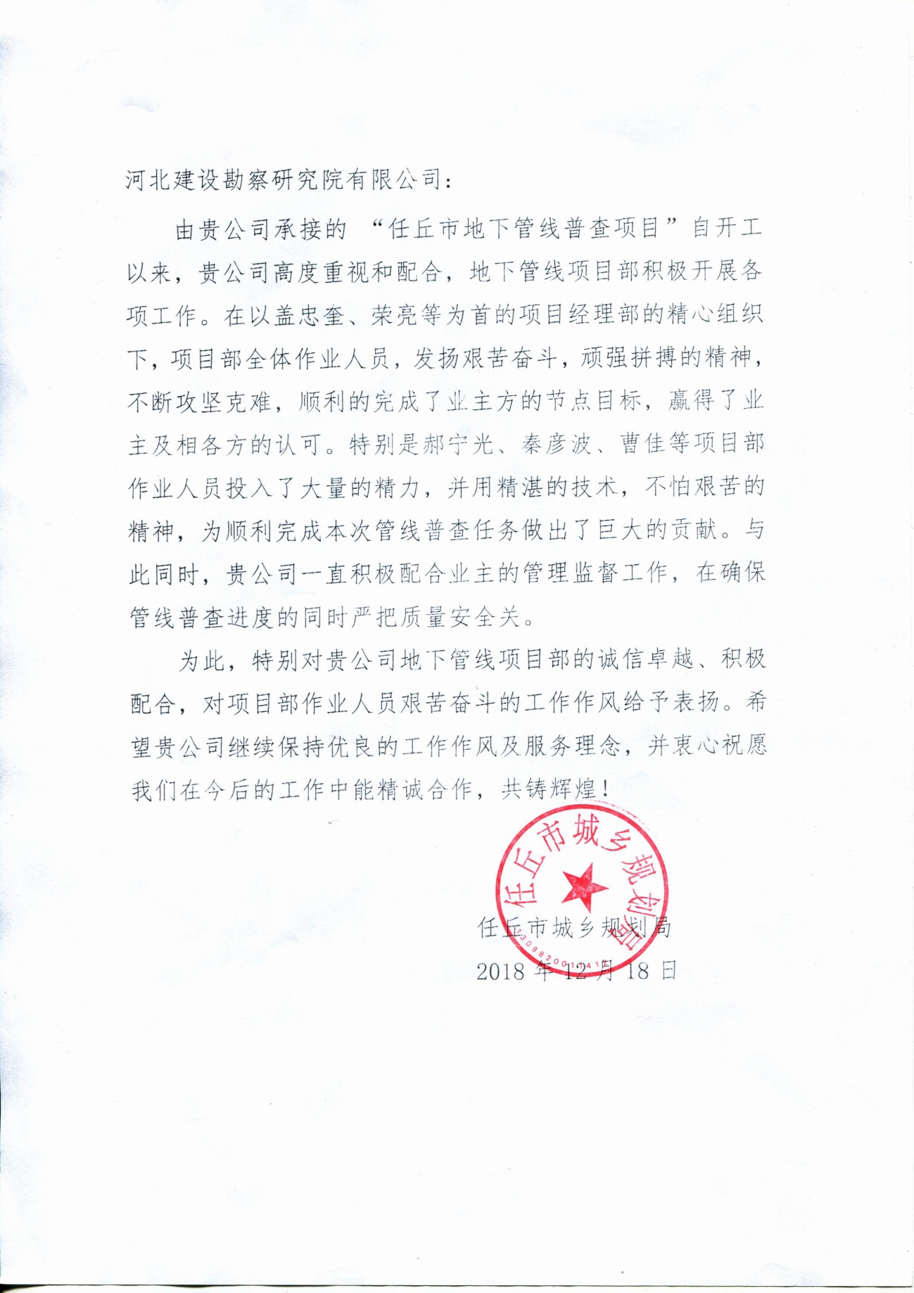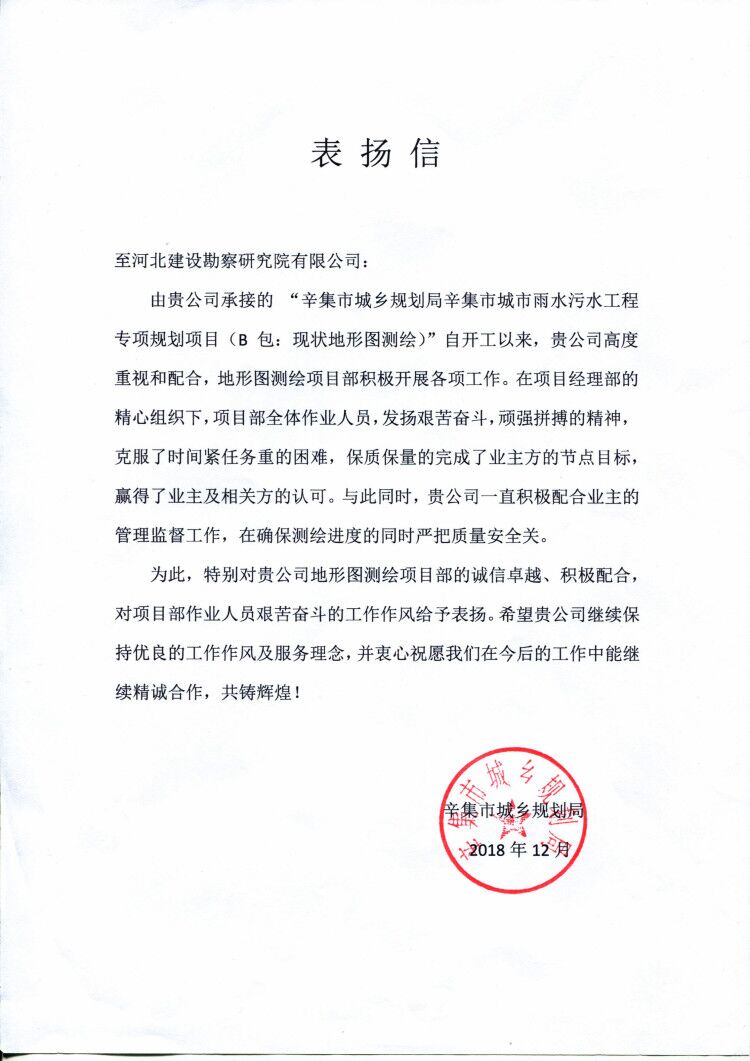 近日,公司收到辛集市城鄉(xiāng)規(guī)劃局和任丘市城鄉(xiāng)規(guī)劃局發(fā)來的表揚信,分別對我公司誠信卓越、積極配合及項目部作業(yè)人員艱苦奮斗的工作作風給予表揚。特別是在任丘地下管線普查項目中,在以蓋忠奎、榮亮為代表的項目部精心組織下,項目全體作業(yè)人員,發(fā)揚艱苦奮斗、頑強拼搏的精神,不斷攻堅克難,保質保量提前完成了生產任務,贏得了業(yè)主的認可。甲方特發(fā)來表揚信,對我公司所作出的貢獻表示感謝!并希望我們繼續(xù)保持優(yōu)良的工作作風及服務理念,精誠合作,共創(chuàng)輝煌!