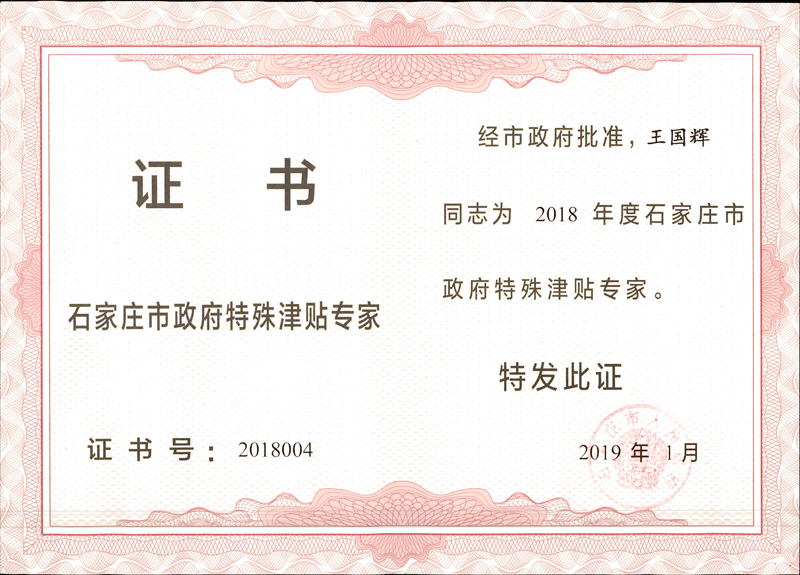 經(jīng)石家莊市人力資源和社會(huì)保障局評(píng)審,石家莊市人民政府同意,我公司王國輝同志榮獲石家莊市政府特殊津貼專家稱號(hào)。