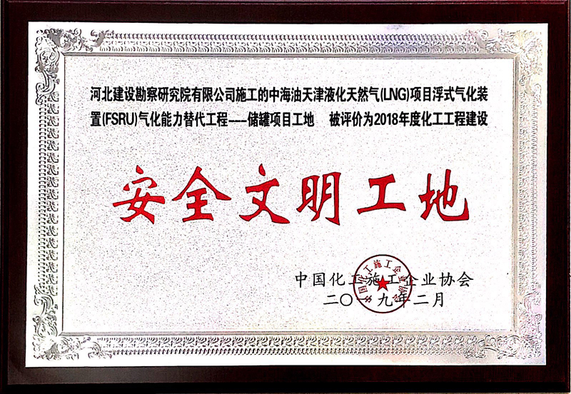 近日傳來喜訊,我公司承接施工的中海油天津液化天然氣(LNG)項目浮式氣化裝置(FSRU)氣化能力替代工程-儲罐項目樁基工程工地被評為2018年度中國化工工程建設安全文明工地,紅彤彤的證書不僅是榮譽和驕傲,也是對我們中海油天津LNG替代工程項目部全體員工付出汗水的最好回報和肯定。