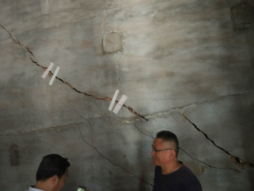 本工程勘察場(chǎng)地位于聊城市茌平縣,茌平華宇氧化鋁公司場(chǎng)內(nèi)2個(gè)堿罐與其北側(cè)2個(gè)配電室樓體周邊為本次的勘察區(qū)域。堿罐直徑8m,高10m,兩堿罐間距1.7m,現(xiàn)罐區(qū)周圍約20m×20m范圍內(nèi)土體發(fā)生膨脹,局部地面產(chǎn)生地表裂縫,兩個(gè)配電室樓體南側(cè)出現(xiàn)裂縫,裂縫位置距堿罐約30m。