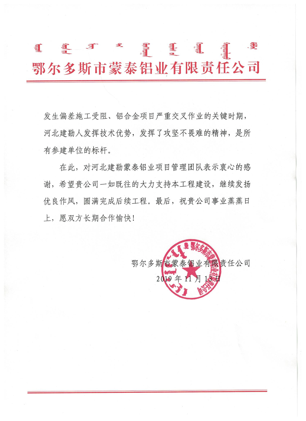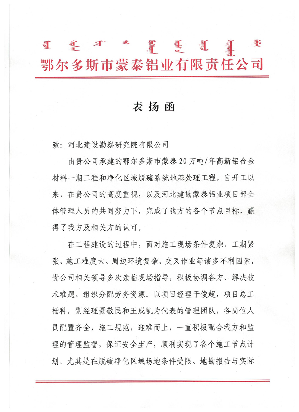 近日,鄂爾多斯市蒙泰鋁業(yè)有限責任公司發(fā)來的表揚函,對我項目部負責施工的鄂爾多斯蒙泰20萬噸/年高新鋁合金材料一期工程和凈化區(qū)域脫硫系統(tǒng)地基處理工程在施工過程中的優(yōu)異表現(xiàn)予以表揚。
