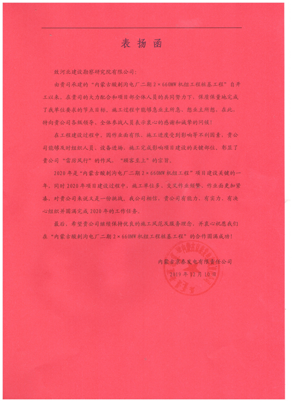 近日,由我公司承建的內(nèi)蒙古酸刺溝二期2×660WM機(jī)組工程樁基工程收到甲方內(nèi)蒙古京泰發(fā)電有限公司的表揚(yáng)信,對項(xiàng)目部全體員工的辛勤付出,給予了高度認(rèn)可和評價,并為后續(xù)雙方的合作奠定了良好基礎(chǔ)。這充分彰顯了河北建勘人“雷厲風(fēng)行”的作風(fēng),“顧客至上”的宗旨。我們將繼續(xù)保持我們的施工風(fēng)范和服務(wù)理念,再接再厲,圓滿完成后續(xù)施工任務(wù)!