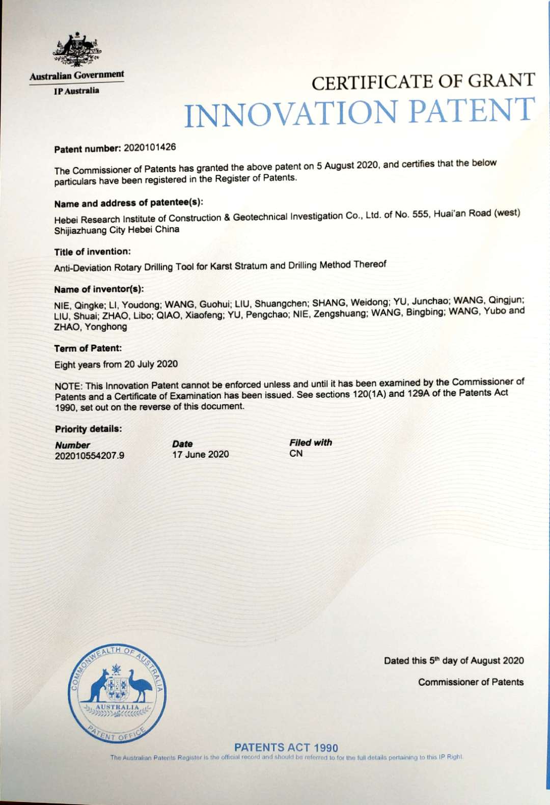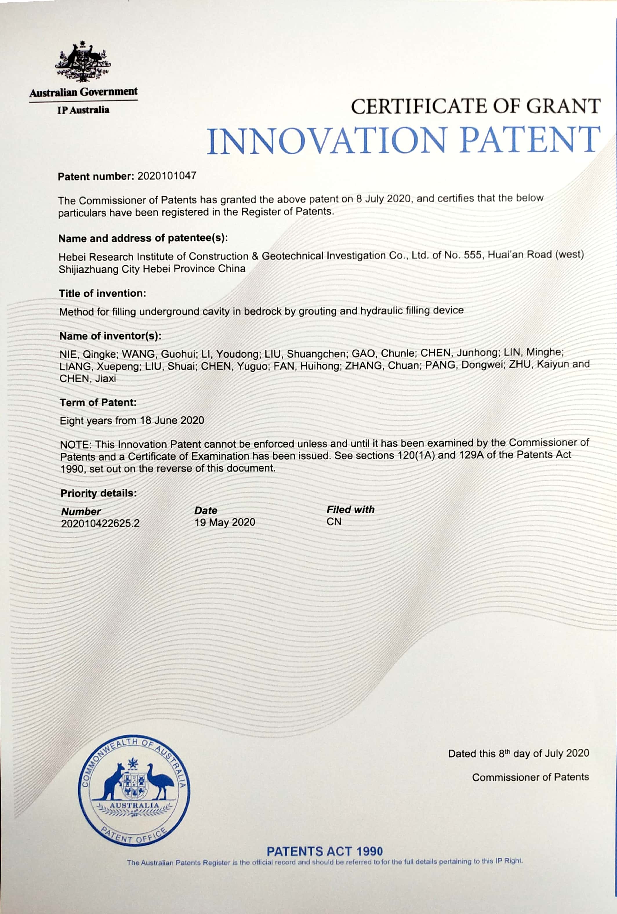 近日,由我公司開發(fā)完成的兩項(xiàng)新技術(shù):“一種填料注漿充填基巖地下空洞的方法以及一種水力充填裝置”、“一種巖溶底層旋挖鉆孔防斜鉆具及鉆孔方法”,被授予澳大利亞專利權(quán)。這是公司第一次申請國際專利,申請成功提升了公司無形資產(chǎn)價(jià)值與品牌價(jià)值,體現(xiàn)了我公司較強(qiáng)的技術(shù)創(chuàng)新能力及企業(yè)綜合實(shí)力。