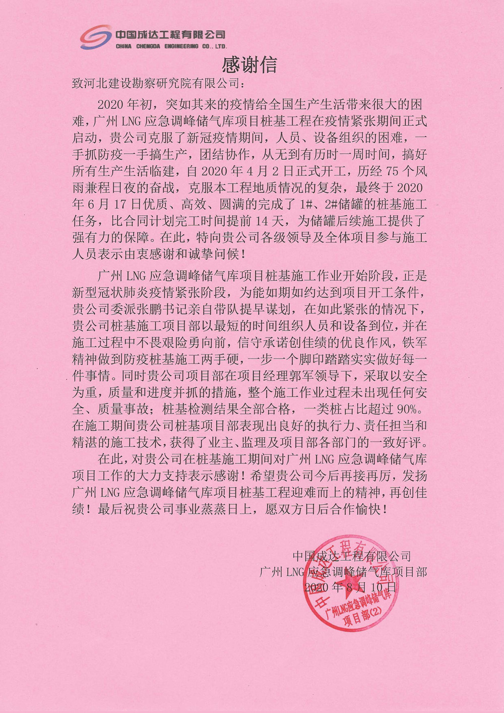 近日,我公司廣州LNG應(yīng)急調(diào)峰儲氣庫項(xiàng)目收到成達(dá)公司發(fā)放的感謝信。廣州LNG應(yīng)急調(diào)峰項(xiàng)目是我公司首次在LNG行業(yè)打入廣州市場,也是首次和中國成達(dá)工程公司進(jìn)行合作,項(xiàng)目部全體員工發(fā)揚(yáng)公司的鐵軍精神做到防疫施工兩手硬,不畏艱險勇向前,齊心協(xié)力、積極策劃,圓滿的完成了各項(xiàng)任務(wù),為廣州LNG應(yīng)急調(diào)峰項(xiàng)目順利實(shí)施打下良好的基礎(chǔ);在施工中,項(xiàng)目安全生產(chǎn)管理到位,質(zhì)量工藝管控優(yōu)良,贏得了業(yè)主、監(jiān)理及相關(guān)各方高度認(rèn)可。對全體參建本項(xiàng)目的領(lǐng)導(dǎo)與員工表示了衷心的感謝,并希望在后續(xù)的工程建設(shè)中,繼續(xù)發(fā)揚(yáng)河北建勘的優(yōu)良工作作風(fēng)!