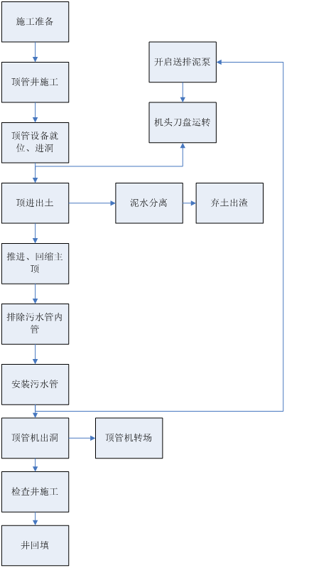 作為本次工程項目運(yùn)用泥水平衡頂管機(jī)的施工技術(shù)工藝流程圖,前期準(zhǔn)備、工作井、接收井施工、設(shè)備就位、安裝止水膠圈、進(jìn)洞、頂進(jìn)出土、分離泥水、回縮主頂、安裝頂管、頂管機(jī)出洞轉(zhuǎn)場,進(jìn)行檢查井施工后回填。