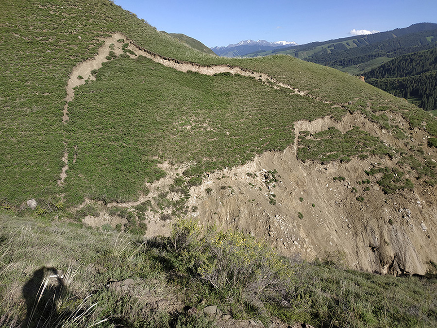 山體滑坡:白楊溝豐源煤礦生產(chǎn)調(diào)度樓北側(cè)邊坡出現(xiàn)了滑坡,滑坡體表面巖土體松散,在降雨條件下有進(jìn)一步發(fā)生滑坡的可能?;缕履_下有安全生產(chǎn)調(diào)度樓等建(構(gòu))筑物,如果再次發(fā)生滑坡,會(huì)危及生產(chǎn)調(diào)度樓及其周?chē)ㄖ锏娜藛T生命和財(cái)產(chǎn)安全,因此需要對(duì)該滑坡進(jìn)行勘查及治理,保證人員生命和財(cái)產(chǎn)安全。