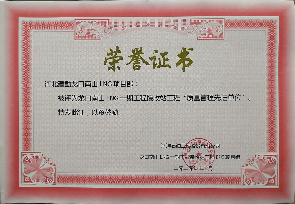 2020年12月,公司收到海洋石油工程股份有限公司發(fā)來的表揚信,對我公司在龍口南山LNG一期工程接收站工程EPC項目儲罐樁基工程標(biāo)段一施工過程中,面對施工現(xiàn)場地質(zhì)情況復(fù)雜、新工藝、施工難度大、氣候炎熱多雨、新冠疫情、人材機緊缺等不利因素,按合同要求順利完成了一標(biāo)段1#和2#儲罐3497根振沖碎石樁和720根樁柱一體化灌注樁全部施工任務(wù),給予了高度認可和好評,并表示感謝!我公司被評為“質(zhì)量管理先進單位”和“HSE管理先進單位”并頒發(fā)了榮譽證書,同時對先進個人頒發(fā)了“優(yōu)秀項目管理者”、 “HSE管理先進個人”、 “質(zhì)量管理先進個人”榮譽證書。