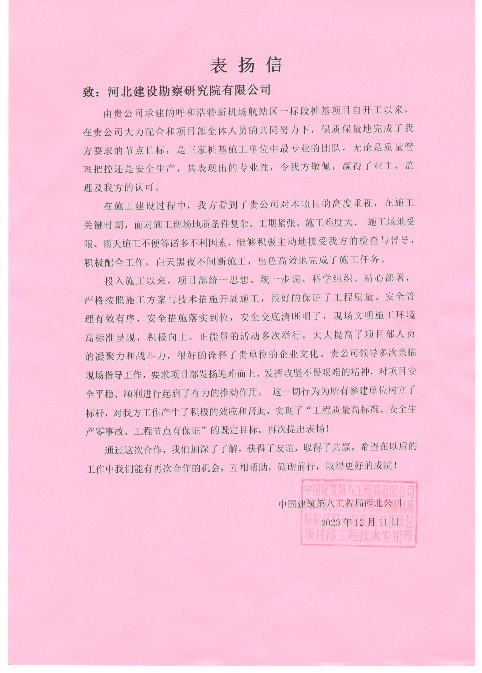近日,公司收到中國化學(xué)賽鼎寧波工程有限公司福建申馬環(huán)己酮項目部、中國建筑第八工程局西北公司呼和浩特新機(jī)場航站區(qū)一標(biāo)段樁基項目部的表揚信。