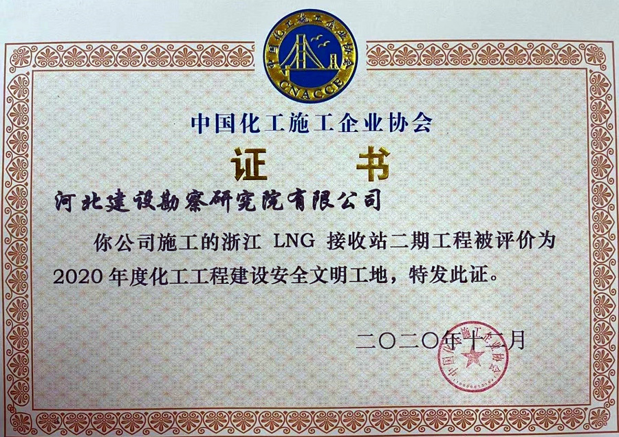 公司浙江LNG項(xiàng)目被中國(guó)化工施工企業(yè)協(xié)會(huì)評(píng)為2020年度化工工程建設(shè)安全文明工地