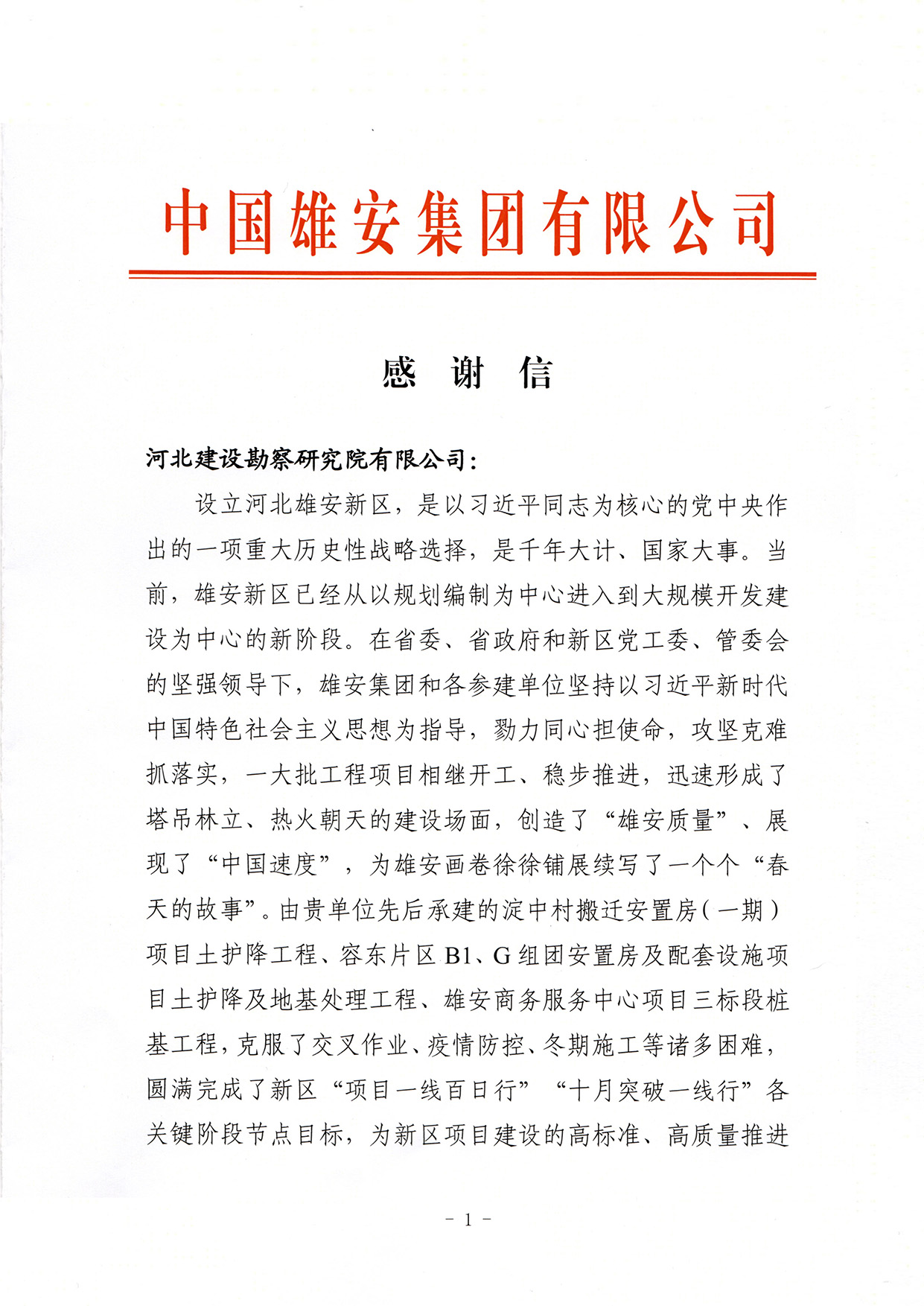 公司收到中國雄安集團(tuán)有限公司感謝信