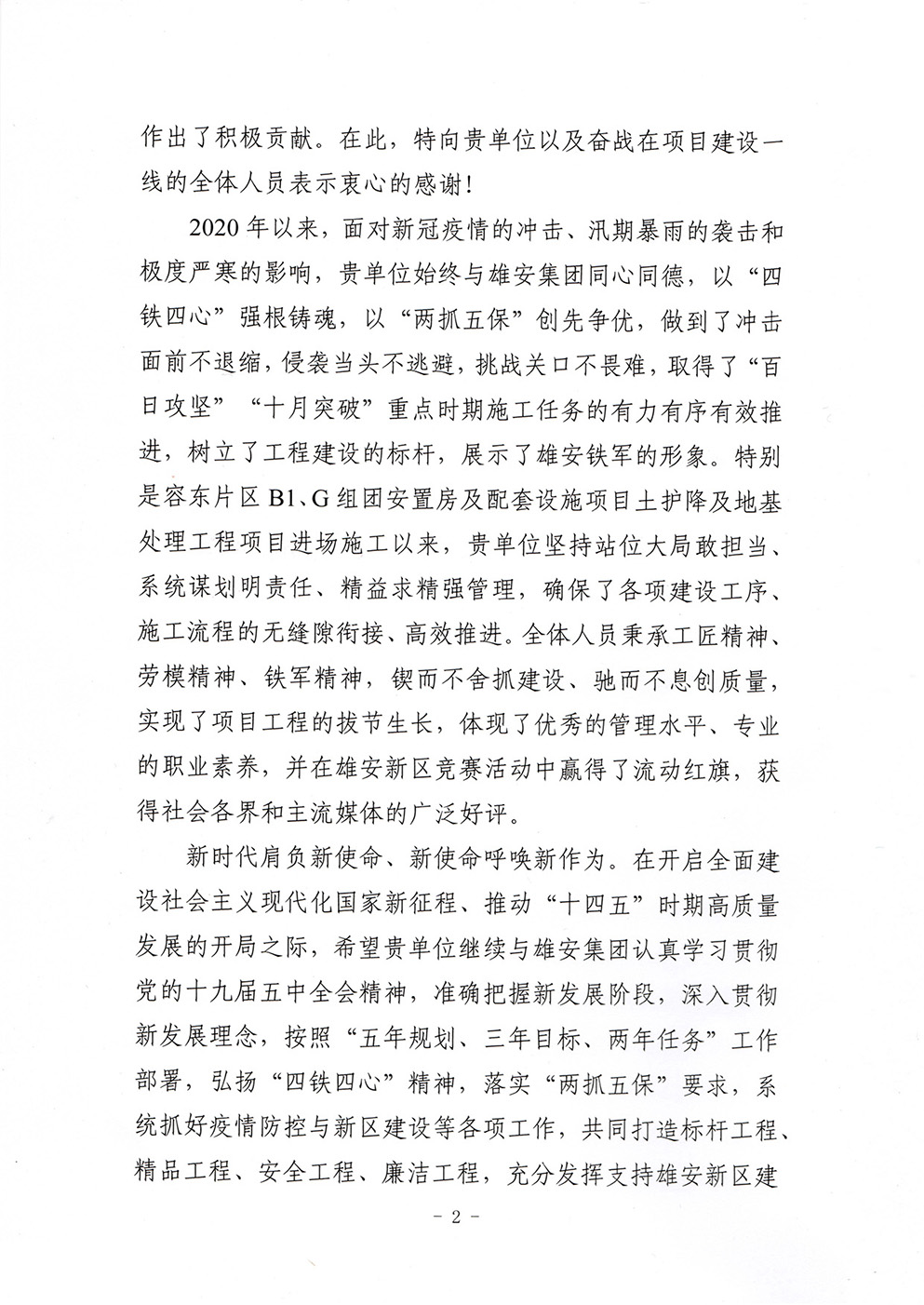 近日,公司收到中國雄安集團(tuán)有限公司發(fā)來的感謝信。感謝我公司先后承建的淀中村搬遷安置房(一期)項(xiàng)目土護(hù)降工程、容東片區(qū)B1、G組團(tuán)安置房及配套設(shè)施項(xiàng)目土護(hù)降及地基處理工程、雄安商務(wù)服務(wù)中心項(xiàng)目三標(biāo)段樁基工程,在施工過程中,堅(jiān)持站位大局敢擔(dān)當(dāng)、系統(tǒng)謀劃明責(zé)任、精益求精強(qiáng)管理,確保了各項(xiàng)建設(shè)工序、施工流程的無縫銜接、高效推進(jìn)。全體人員秉承工匠精神、勞模精神、鐵軍精神,鍥而不舍抓建設(shè)、馳而不息創(chuàng)質(zhì)量,實(shí)現(xiàn)了項(xiàng)目工程的拔節(jié)生長,體現(xiàn)了優(yōu)秀的管理水平、專業(yè)的職業(yè)素養(yǎng),并在雄安新區(qū)競賽活動(dòng)中贏得了流動(dòng)紅旗,獲得社會(huì)各界和主流媒體的廣泛好評(píng)。