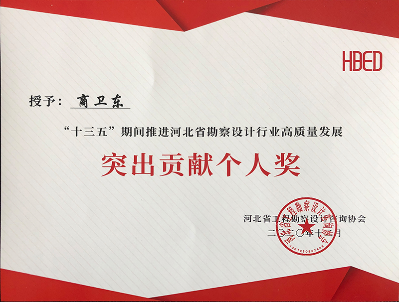 由河北省工程勘察設(shè)計(jì)咨詢協(xié)會評選,公司榮獲“十三五”期間推進(jìn)河北省勘察設(shè)計(jì)行業(yè)高質(zhì)量發(fā)展突出貢獻(xiàn)單位,韓立君董事長、李華偉總經(jīng)理、商衛(wèi)東主任榮獲“十三五”期間“推進(jìn)河北省勘察設(shè)計(jì)行業(yè)高質(zhì)量發(fā)展突出貢獻(xiàn)個人”。
