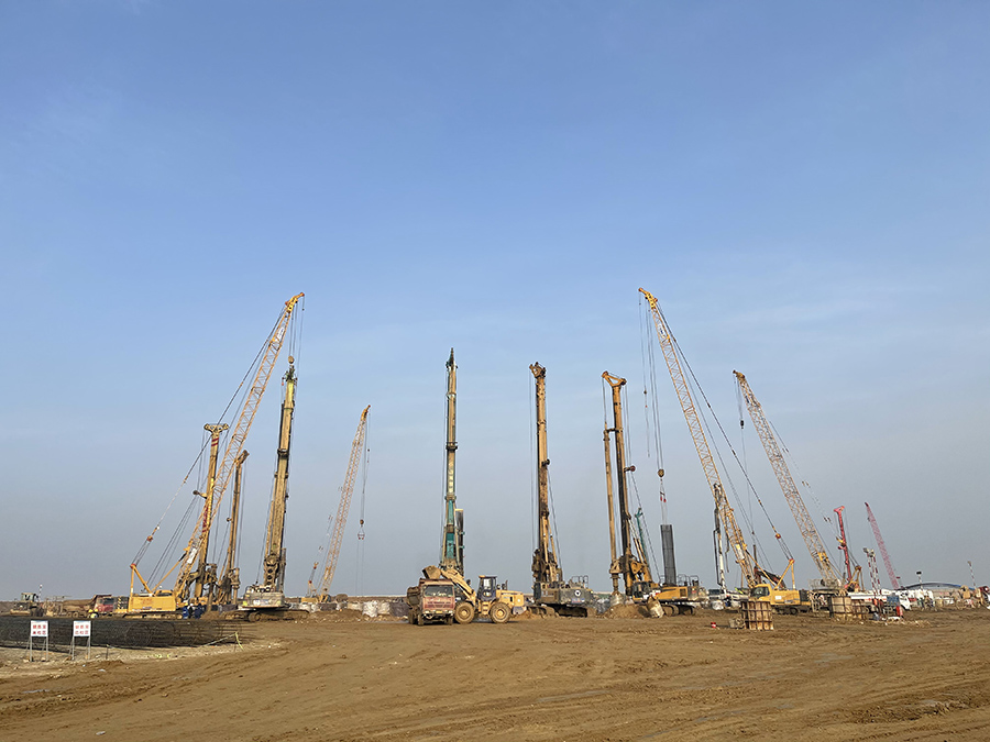 我公司主要承接本工程2#、4#儲罐樁柱一體化灌注樁施工任務,該項目自2020年12月1日開工,2021年3月8日完工。主要完成的工作內容為:樁柱一體灌注776根,樁徑1.4m,樁身混凝土強度C40,抗?jié)B等級P8,混凝土用量約96123m³,鋼筋用量7682t,地上部分柱高1.32m~1.62m,每根樁樁頂預留8個隔震墊安裝孔洞。樁基檢測:合格率為100%,低應變檢測776根樁, I類樁占比99%,聲波檢測78根樁,單樁豎向承載力極限值為14000KN,單樁豎向承載力8根樁全部符合設計要求。