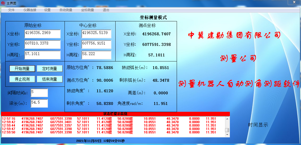 在橋梁轉(zhuǎn)體過程中,我們采用國內(nèi)最先進(jìn)的全自動(dòng)測量機(jī)器人并結(jié)合自主研發(fā)的跟蹤測量軟件,對(duì)橋梁實(shí)施運(yùn)行軌跡和震動(dòng)監(jiān)控監(jiān)測。在轉(zhuǎn)體過程中嚴(yán)格控制轉(zhuǎn)體橋轉(zhuǎn)體角速度,并對(duì)軸線合攏進(jìn)行測量,指揮施工單位對(duì)轉(zhuǎn)體橋進(jìn)行點(diǎn)動(dòng),最終達(dá)到設(shè)計(jì)要求,本次軸線合攏精度達(dá)到5mm,滿足設(shè)計(jì)要求。