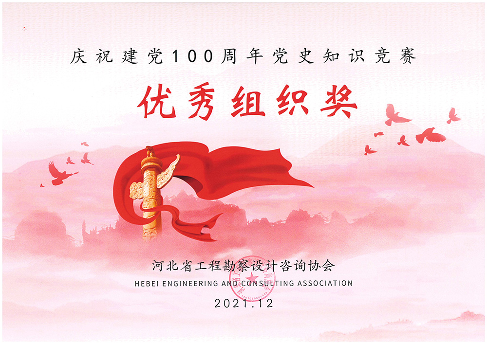 2021年,為隆重慶祝中國共產(chǎn)黨成立 100 周年,號召廣大黨員群眾進(jìn)一步了解黨的百年奮斗史,以史為鑒,砥礪前行,為行業(yè)高質(zhì)量發(fā)展作出積極貢獻(xiàn),河北省工程勘察設(shè)計(jì)咨詢協(xié)會主辦了以“重溫黨史,不忘初心”為主題的黨史知識學(xué)習(xí)競賽活動。公司黨委組織公司廣大黨員群眾積極踴躍參加,并取得較好學(xué)習(xí)效果。近日,被河北省工程勘察設(shè)計(jì)咨詢協(xié)會授予“優(yōu)秀組織獎”。