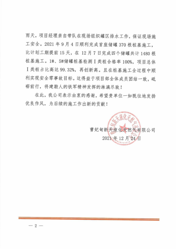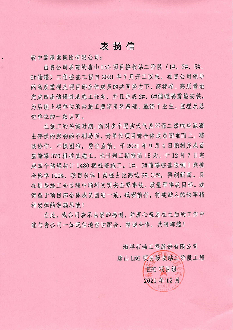 唐山LNG項(xiàng)目接收站二階段工程樁基工程項(xiàng)目部建設(shè)規(guī)模為4座20萬m³LNG儲罐,項(xiàng)目順利實(shí)現(xiàn)質(zhì)量零事故、安全零事故目標(biāo),贏得總包、監(jiān)理及業(yè)主的一致認(rèn)可與高度肯定。