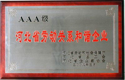 3月28日在河北會(huì)堂召開(kāi)的“河北省創(chuàng)建勞動(dòng)關(guān)系和諧企業(yè)表彰會(huì)”上,我公司被授于“河北省AAA級(jí)勞動(dòng)關(guān)系和諧企業(yè)”。省委常委、省總工會(huì)主席藏勝業(yè)同志向公司董事長(zhǎng)韓立君同志頒發(fā)了獎(jiǎng)牌。