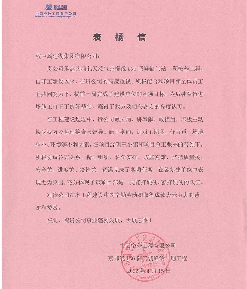 京邯線LNG儲(chǔ)氣調(diào)峰站一期項(xiàng)目樁基工程精心組織、科學(xué)安排、攻堅(jiān)克難,提前一周完工交付,為上部單位進(jìn)場施工打下良好基礎(chǔ),贏得了總包方及相關(guān)各方的高度認(rèn)可。