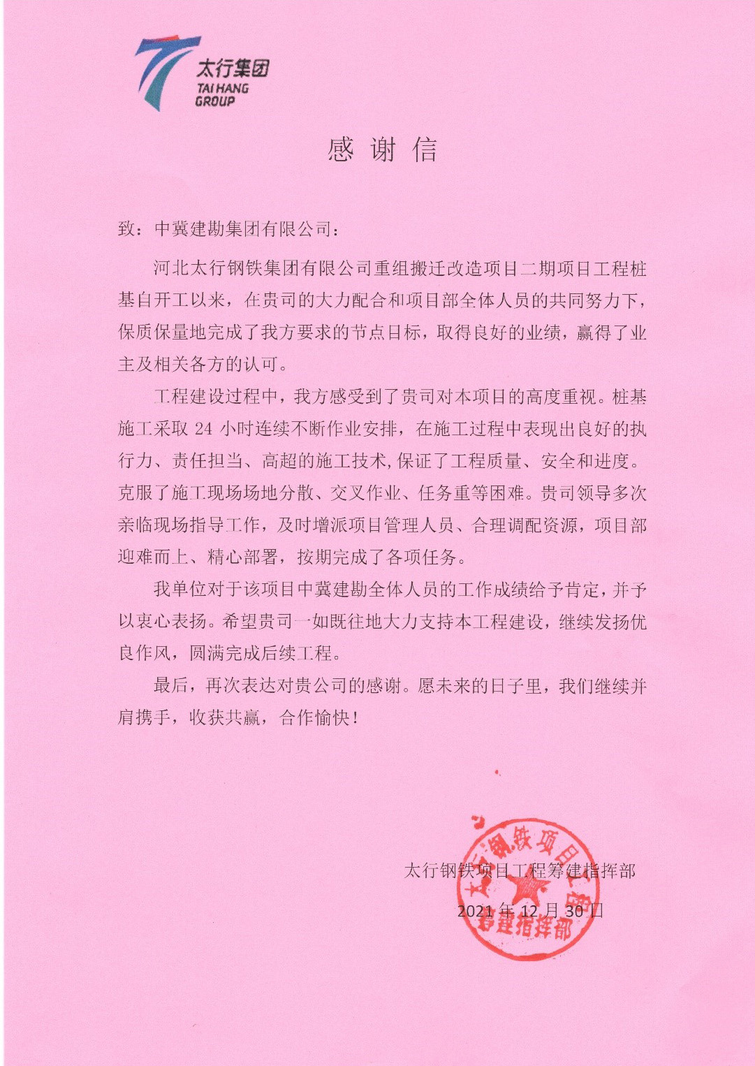 河北太行鋼鐵集團(tuán)有限公司重組搬遷改造項(xiàng)目二期項(xiàng)目樁基工程位于河北武安工業(yè)園區(qū)南洺河工業(yè)園。本項(xiàng)目包括焦電聯(lián)產(chǎn)、二期發(fā)電、洗煤廠及二期1座高爐等附屬設(shè)施。施工期間迫于業(yè)主工期要求,不斷增加區(qū)域和設(shè)備,同時(shí)涉及多處交叉施工,給施工開展及管理帶來了一定難度。通過公司的大力支持、項(xiàng)目部的統(tǒng)籌安排以及全體人員的辛苦付出。面對(duì)規(guī)模較大、場(chǎng)地分散、交叉施工等多項(xiàng)不利因素,項(xiàng)目全體人員盡職盡責(zé),確保項(xiàng)目順利開展,整個(gè)施工期間未發(fā)生安全質(zhì)量事故,各項(xiàng)指標(biāo)均滿足合同要求,充分發(fā)揮建勘精神。得到了業(yè)主的認(rèn)可和贊揚(yáng),并收到業(yè)主發(fā)來的表揚(yáng)信,為以后更多的合作奠定基礎(chǔ)。