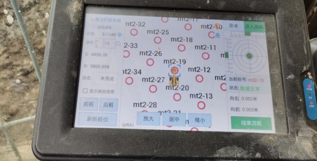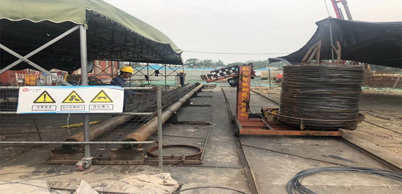 本工程自2021年2月21日開工,2022年3月21日完工,總歷時(shí)375天。2021年5月進(jìn)入施工高峰期,使用旋挖鉆機(jī)9臺(tái),每日完成樁數(shù)約 70根。由于測(cè)放樁位的工作量大,采用全站儀測(cè)放效率較低,影響施工進(jìn)度,經(jīng)研究引進(jìn)了智能打樁系統(tǒng)。在引進(jìn)智能打樁系統(tǒng)后,先與全站儀測(cè)放的樁位進(jìn)行對(duì)比測(cè)試,對(duì)其測(cè)放樁位的精度和效率進(jìn)行了驗(yàn)證,滿足精度要求,并在項(xiàng)目實(shí)施過(guò)程中及時(shí)總結(jié)使用經(jīng)驗(yàn),為進(jìn)一步推廣智能化打樁系統(tǒng)的應(yīng)用打好基礎(chǔ)。本工程在鋼筋籠制作方面,采用了3臺(tái)滾籠機(jī)進(jìn)行箍筋纏繞工作,提高了工作效率并減少了人員投入,保證了施工進(jìn)度需要。