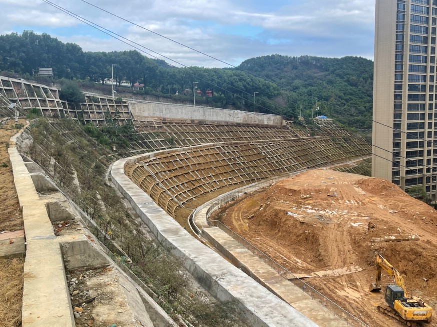 本工程位于浙江省永嘉縣甌北街道烏山路嶼塘山桃源陵園路段,本工程為大型地質(zhì)災(zāi)害治理施工項(xiàng)目,主要施工內(nèi)容包括邊坡削坡、人工挖孔樁、鉆孔灌注樁、微型樁、錨桿格構(gòu)、毛石擋墻、板肋式擋墻、扶壁擋墻、盲溝、截排水溝、深部排水孔、錨索、護(hù)欄欄桿、樁間擋板、平臺硬化、噴坡綠化、路面修復(fù)等。