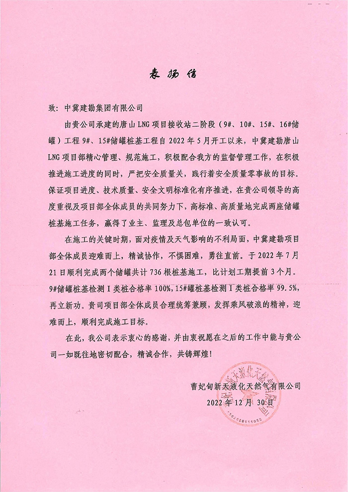2022年12月30日我公司收到業(yè)主曹妃甸新天液化天然氣有限公司發(fā)來的表?yè)P(yáng)信。由我公司承建的唐山LNG項(xiàng)目接收站二階段(9#、10#、15#、16#儲(chǔ)罐)工程9#、15#儲(chǔ)罐樁基工程,主要施工內(nèi)容為736根樁徑1.4m、樁長(zhǎng)71m/74m混凝土灌注樁,本項(xiàng)目自2022年5月31日開工以來,在唐山LNG項(xiàng)目部精心管理、規(guī)范施工下,嚴(yán)把安全質(zhì)量關(guān),踐行著安全質(zhì)量零事故目標(biāo),于2022年7月21日順利完成所有施工任務(wù),贏得業(yè)主、監(jiān)理及總包的一致認(rèn)可。樁基檢測(cè)完成后,9#儲(chǔ)罐樁基檢測(cè)I類樁率100%,15#儲(chǔ)罐I類樁率99.5%,再創(chuàng)新高。在施工過程中,項(xiàng)目部全體成員面對(duì)惡劣天氣的不利影響及新冠疫情肆虐的局面,迎難而上,精誠(chéng)協(xié)作,砥礪前行,淋漓盡致地詮釋了建勘人的鐵軍精神,為項(xiàng)目順利完成奠定堅(jiān)實(shí)基礎(chǔ)。