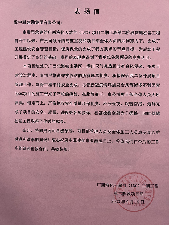 廣西液化天然氣LNG項(xiàng)目5#6#儲(chǔ)罐樁基項(xiàng)目是國(guó)家管網(wǎng)集團(tuán)北海液化天然氣有限責(zé)任公司非常重視的項(xiàng)目。我公司自2022年04月承接了廣西LNG二期項(xiàng)目?jī)?chǔ)罐樁基施工,本項(xiàng)目于2022年5月20日開始,7月11日完成。從施工開始,本項(xiàng)目24小時(shí)晝夜不間斷施工,為保障工程高質(zhì)量高效率完成,施工期間,建設(shè)單位、PMC單位、監(jiān)理單位及施工單位配備了充足的管理人員及施工人員,在疫情肆虐,天氣炎熱,雨季臺(tái)風(fēng)等一系列困難重重之下,廣西LNG項(xiàng)目部全體員工保持高度的工作熱情,克服一切艱難險(xiǎn)阻,順利完成了樁基施工全部任務(wù)。樁基檢測(cè)結(jié)果全部為Ⅰ類樁,保質(zhì)保量的完成了各個(gè)里程碑節(jié)點(diǎn)目標(biāo),榮獲國(guó)家管網(wǎng)集團(tuán)北海液化天然氣有限責(zé)任公司廣西北海LNG二期項(xiàng)目部的表?yè)P(yáng)信及優(yōu)秀優(yōu)秀承包商集體榮譽(yù)。