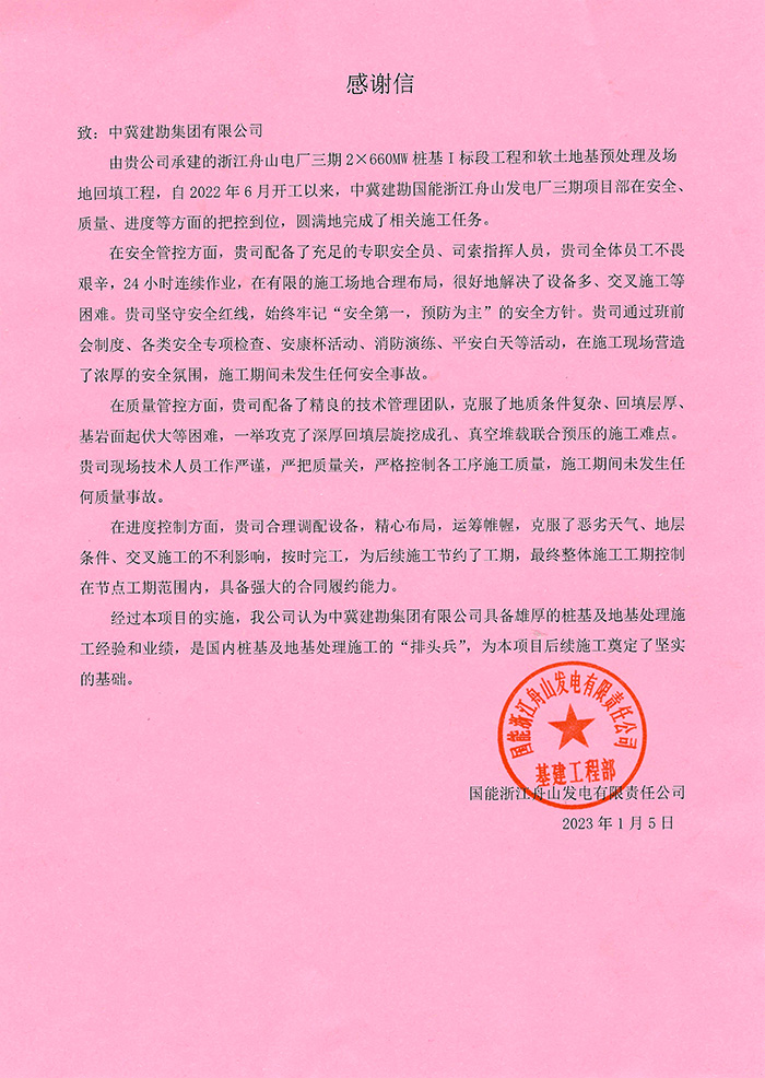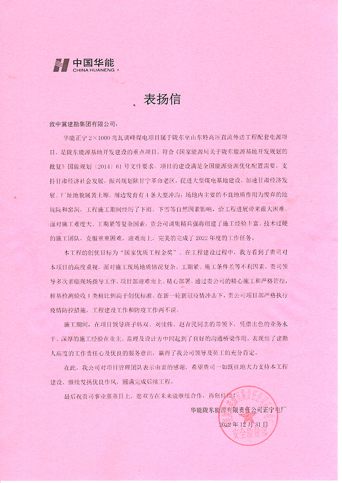 我公司華能甘肅正寧電廠二期工程項(xiàng)目部收到業(yè)主方華能隴東能源公司正寧電廠發(fā)來的表?yè)P(yáng)信,施工期間,在項(xiàng)目領(lǐng)導(dǎo)的帶領(lǐng)下,憑借出色的業(yè)務(wù)水平、深厚的施工經(jīng)驗(yàn)在業(yè)主、監(jiān)理及設(shè)計(jì)方中間起到了良好的溝通橋梁作用。本工程的創(chuàng)優(yōu)目標(biāo)為“國(guó)家優(yōu)質(zhì)工程金獎(jiǎng)”,我單位負(fù)責(zé)的B標(biāo)段樁基檢測(cè)驗(yàn)收I類樁比例高于創(chuàng)優(yōu)標(biāo)準(zhǔn)。在新一輪新冠疫情沖擊下,項(xiàng)目部嚴(yán)格執(zhí)行疫情防控措施,工程建設(shè)工作和防疫工作兩不誤表現(xiàn)出了建勘人高度的工作責(zé)任心及優(yōu)良的服務(wù)意識(shí),贏得了華能隴東能源公司領(lǐng)導(dǎo)及員工的充分肯定。