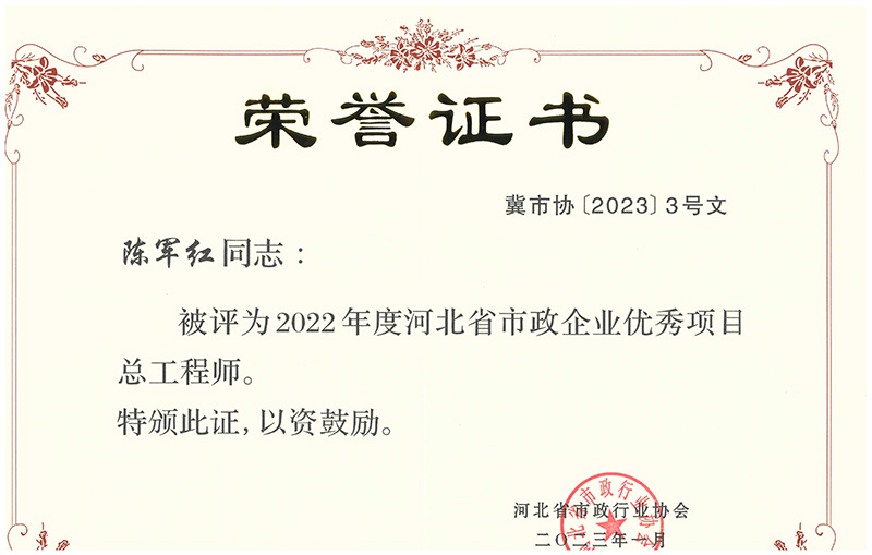 近日,經(jīng)河北省市政行業(yè)協(xié)會組織選拔并發(fā)文公布,我公司王慶軍同志、呂琳同志榮獲 “2021年度河北省市政企業(yè)優(yōu)秀項目經(jīng)理” 榮譽(yù)稱號;陳軍紅同志、張樹楹同志榮獲“2022年度河北省市政企業(yè)優(yōu)秀項目總工程師”榮譽(yù)稱號。