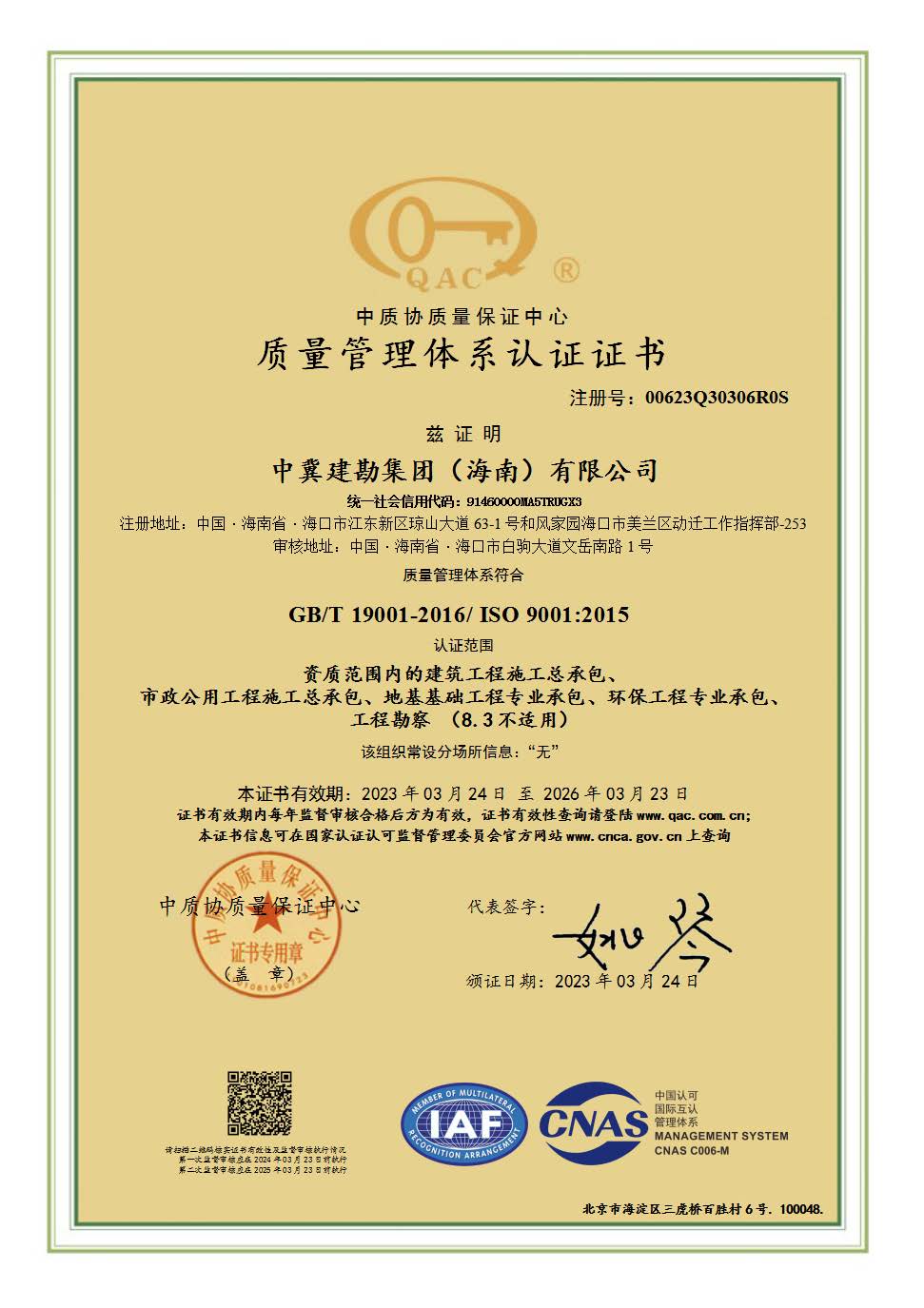 2023年3月13日至18日,經(jīng)認證機構現(xiàn)場審核,中冀建勘集團(海南)有限公司順利通過了綜合管理體系的認證,并于3月24日取得了中質協(xié)質量保證中心頒發(fā)的綜合管理體系認證證書。