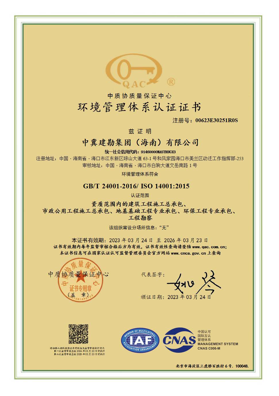 本次認證范圍覆蓋了中冀建勘集團(海南)有限公司現(xiàn)有的建筑工程施工總承包、市政公用工程施工總承包、地基基礎工程專業(yè)承包、環(huán)保工程專業(yè)承包及工程勘察資質。這標志著質量管理體系(GB/T19001-2016)、環(huán)境管理體系(GB/T24001-2016)、職業(yè)健康安全管理體系(GB/T45001-2020)在中冀建勘集團(海南)有限公司有效貫徹運行。