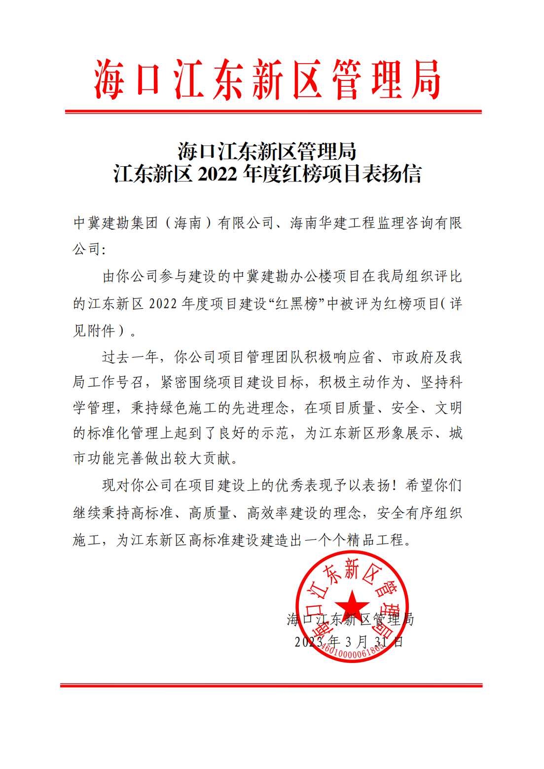 人勤春來早,實干正當(dāng)時。2023年3月31日,為促進(jìn)項目建設(shè)進(jìn)度,營造“安全、文明、有序”的建設(shè)氛圍,??诮瓥|新區(qū)管理局公布了2022年度項目建設(shè)“紅黑榜”,“中冀建勘辦公樓”項目再次受到表彰,并為項目頒發(fā)了榮譽證書。