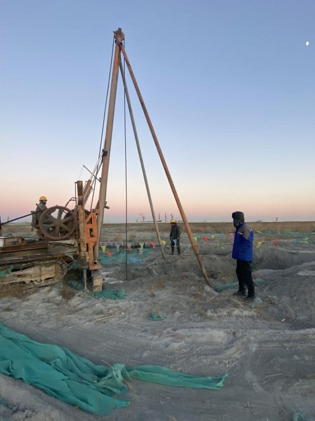 本工程施工場(chǎng)地為超厚層回填粉煤灰,處理難度大,國(guó)內(nèi)沒有類似工程經(jīng)驗(yàn);施工場(chǎng)地大需要投入更多人員和設(shè)備進(jìn)行施工和管理;因緊靠渤海,地下水豐富,為保障降水效果需投入更多資源;季節(jié)性影響,冬季低溫對(duì)施工造成一定難度。針對(duì)以上工程特點(diǎn),我公司項(xiàng)目部經(jīng)過科學(xué)嚴(yán)密的組織和管理,克服各種困難,使工程地質(zhì)條件得到很大的改善。