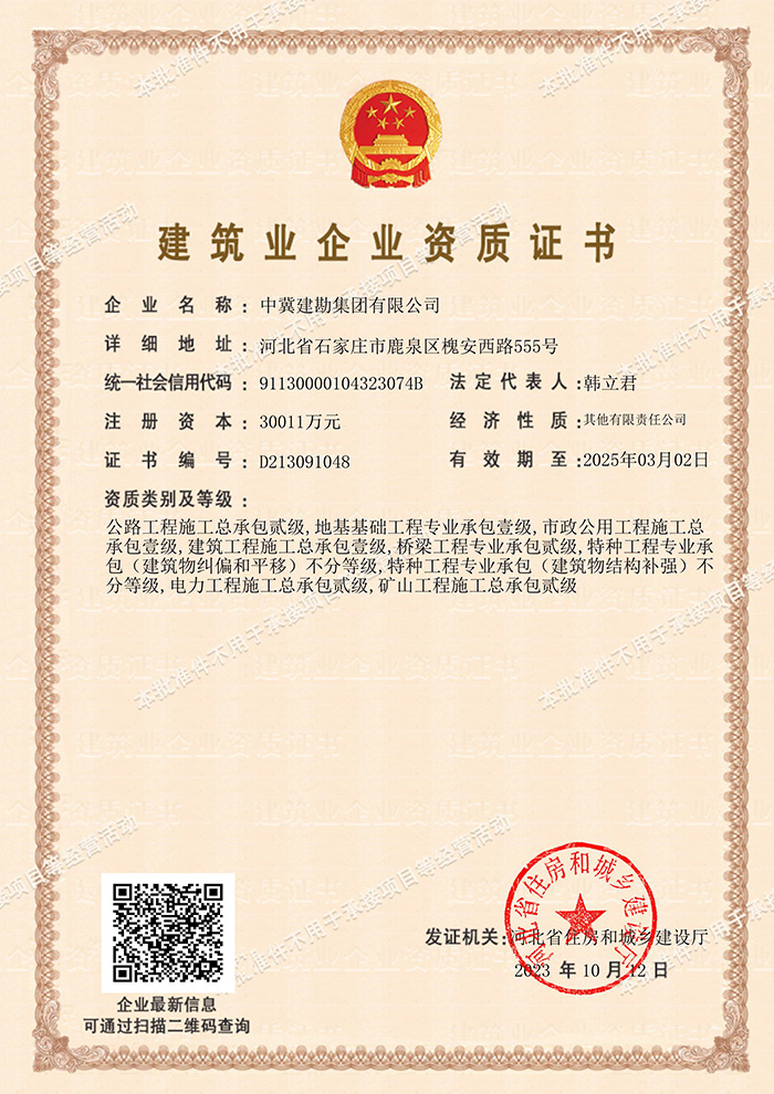 為拓展公司業(yè)務(wù)范圍,在公司領(lǐng)導(dǎo)的精心策劃下,經(jīng)過安全生產(chǎn)部的不懈努力,集團(tuán)公司于2023年10月12日經(jīng)河北省交通廳、河北省住建廳審核批準(zhǔn),成功取得了公路工程施工總承包貳級(jí)資質(zhì),該資質(zhì)的取得將為集團(tuán)公司拓展縣、鄉(xiāng)、村公路工程業(yè)務(wù)提供了先決條件,為增強(qiáng)地方市場(chǎng)的開拓能力、提高地方市場(chǎng)競(jìng)爭(zhēng)力提供有力支撐,將在助力集團(tuán)公司高質(zhì)量發(fā)展、升級(jí)轉(zhuǎn)型上貢獻(xiàn)更大力量。