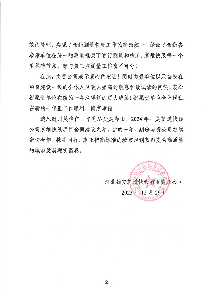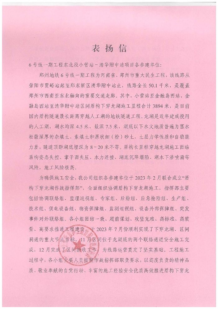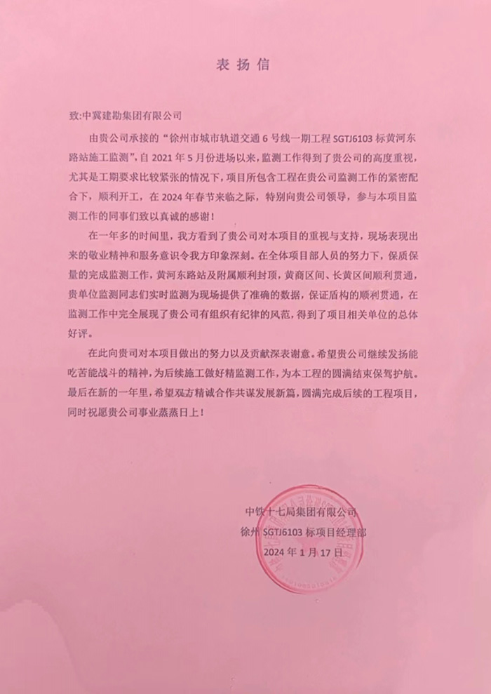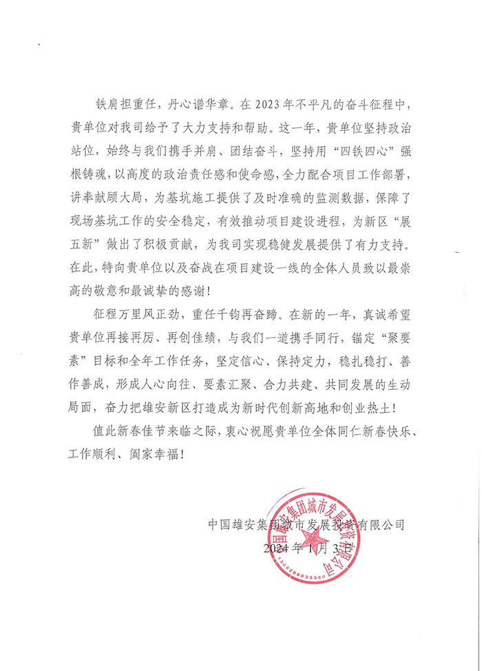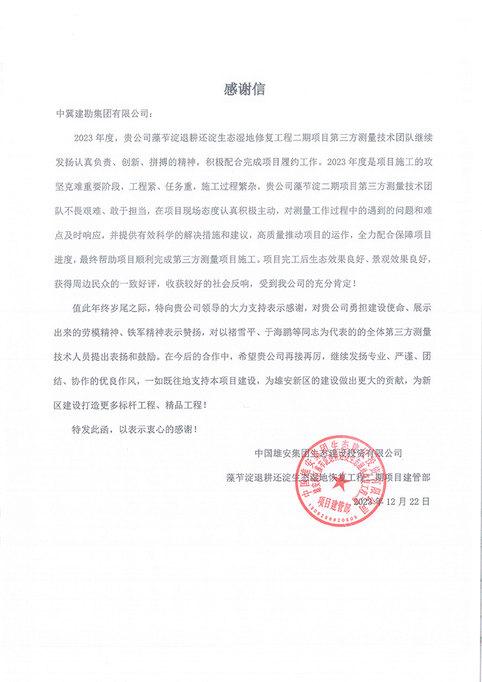 近期,公司陸續(xù)收到中國(guó)雄安集團(tuán)城市發(fā)展投資有限公司、河北雄安軌道快線有限責(zé)任公司、中國(guó)雄安集團(tuán)生態(tài)建設(shè)投資有限公司、中鐵五局、中鐵十七局、鄭州地鐵集團(tuán)、內(nèi)蒙古大唐國(guó)際克什克騰旗煤制天然氣電廠、大唐內(nèi)蒙古多倫電廠等業(yè)主單位發(fā)來(lái)的感謝信。我公司認(rèn)真負(fù)責(zé)、敢打能打硬仗的工作態(tài)度、頑強(qiáng)拼搏的施工風(fēng)范和一心為業(yè)主服務(wù)的理念,贏得了業(yè)主的高度認(rèn)可和贊揚(yáng),特發(fā)來(lái)感謝信深表感謝!