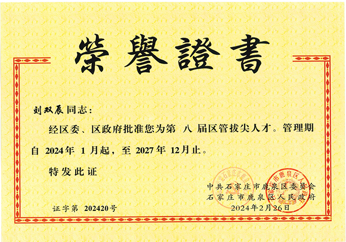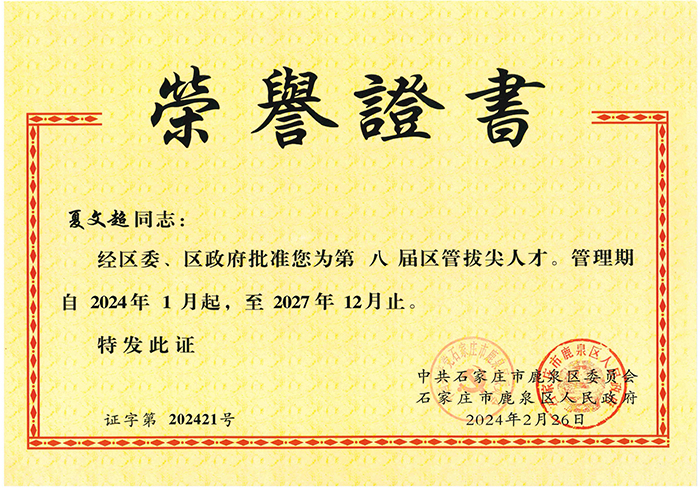 經(jīng)公司組織申報(bào),中共石家莊市鹿泉區(qū)委員會(huì)組織資格審核、綜合評審、征求意見、實(shí)地考察、區(qū)委常委會(huì)議研究等程序,我公司夏文超、劉雙辰入選石家莊市鹿泉區(qū)第八屆拔尖人才。
