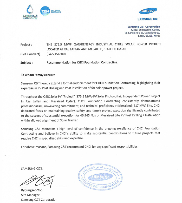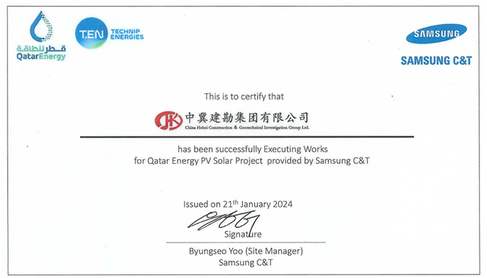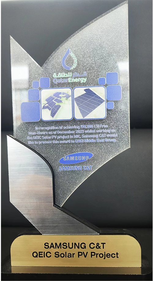我公司收到卡塔爾能源875.5MW光伏發(fā)電項(xiàng)目業(yè)主方卡塔爾能源和總包方三星C&T公司聯(lián)合頒發(fā)的獎(jiǎng)杯和推薦信。業(yè)主及總包方高度認(rèn)可我公司項(xiàng)目履約能力,贊揚(yáng)我司對該項(xiàng)目成功交付做出重大貢獻(xiàn),表示愿意與我司建立長期合作關(guān)系?;谖宜咀吭降穆募s表現(xiàn),三星C&T公司授予我司推薦信。