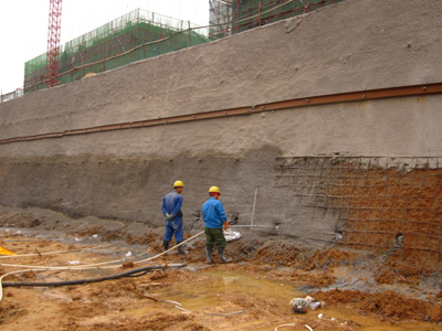 唐山東潤國際廣場基坑支護(hù)及基礎(chǔ)樁工程位于唐山市建設(shè)路與建華東道交叉口,占地面積約2萬平方米,包含基坑邊坡支護(hù)及基礎(chǔ)樁施工兩部分工作內(nèi)容?;娱_挖深度9.8m,采用排樁結(jié)合錨桿、土釘墻的復(fù)合支護(hù)方式,基礎(chǔ)樁采用泥漿護(hù)壁旋挖后壓漿鉆孔灌注樁。其中,施工完成Φ0.6m護(hù)坡樁300根,支護(hù)面積約6700平方米,施工完成Φ0.8m基礎(chǔ)樁622根7000余方;Φ0.4mCFG樁368根700余方。