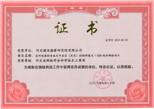 近日,由工程測量公司完成的滄州臨港經(jīng)濟(jì)技術(shù)開發(fā)區(qū)(東區(qū))控制測量及1:500地形測繪項(xiàng)目,被河北省測繪學(xué)會(huì)評(píng)為河北省測繪學(xué)會(huì)科學(xué)技術(shù)三等獎(jiǎng)。